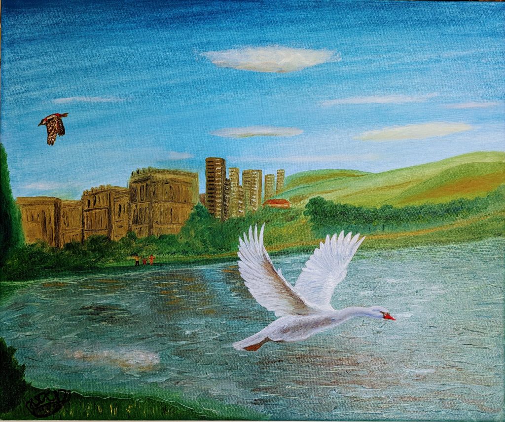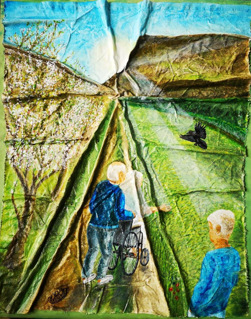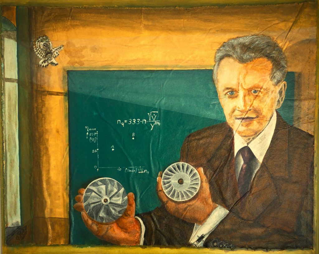 Re#6, „Prof. Dr.-Ing. Dr.sc. Gerd Heinz Grabow im Kolleg“, Geschenk zum 95. Geburtstag an Prof. Grabow am 15.09.2023, Acryl auf Krumpel-Nessel, fixiert auf Hartfaserplatte 50×60 cm, OpenAI DALL-E2 + HHKHH 2023/08