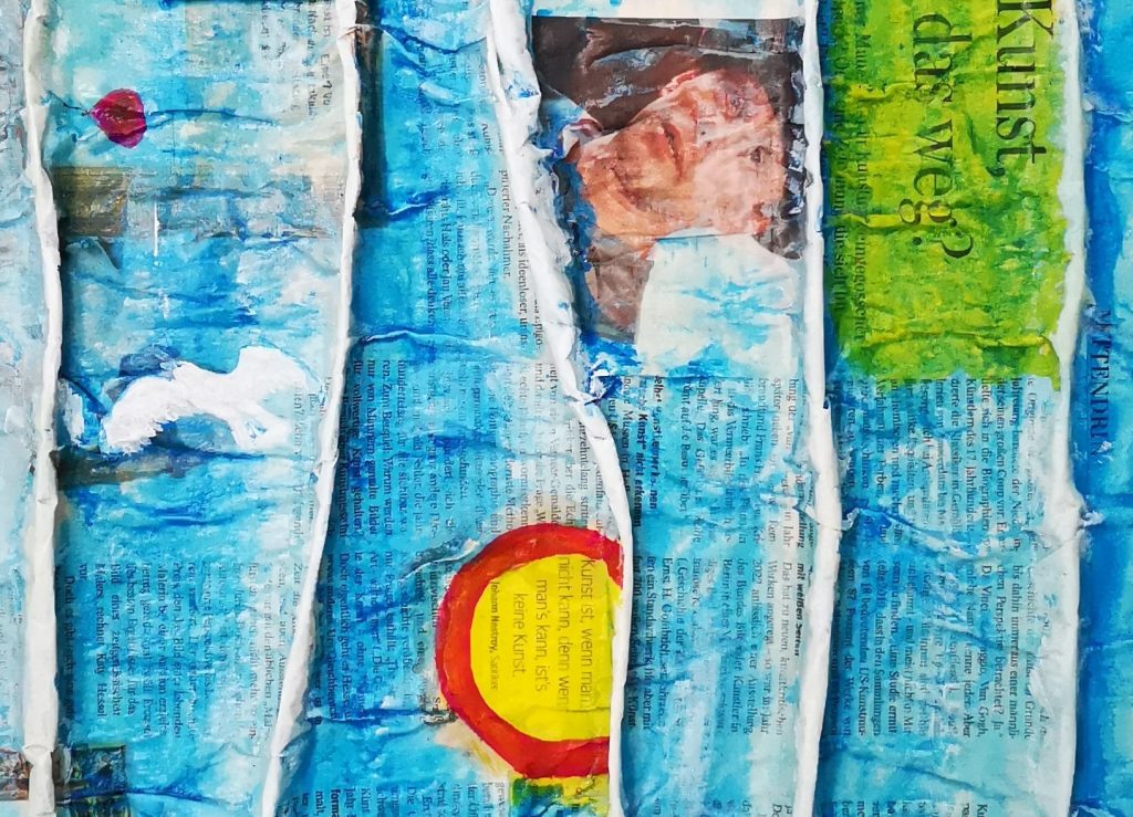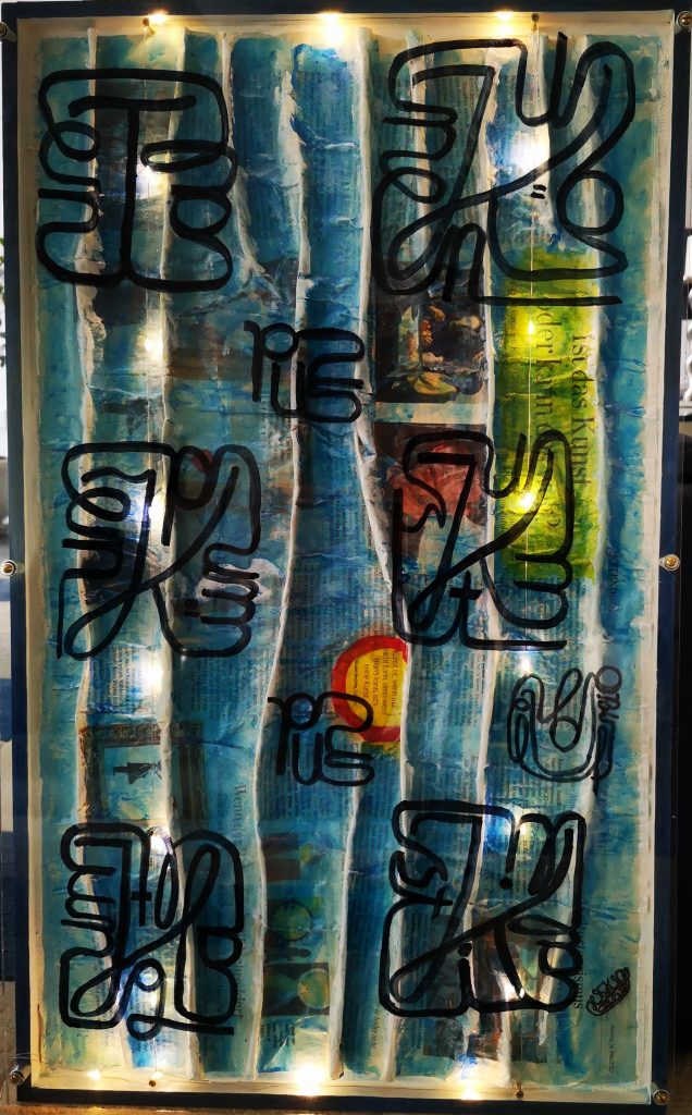 „können & künden & kallistik“, Kunstdefinition von Prof. A. Pretschner, TU München, Blockwörter in Spiegelschrift, Permanent Marker auf Plexyglasscheibe 66,5×40,5 cm, Hinterleuchtung mit Leuchtdiodenkette, HHKHH 2023/10„kunst ist…..“, siehe unten, Acryllasur auf Zeitungspapier, auf Krumpel-Nessel, auf Hartfaserplatte, 38×64,5 cm, HHKHH 2023/04