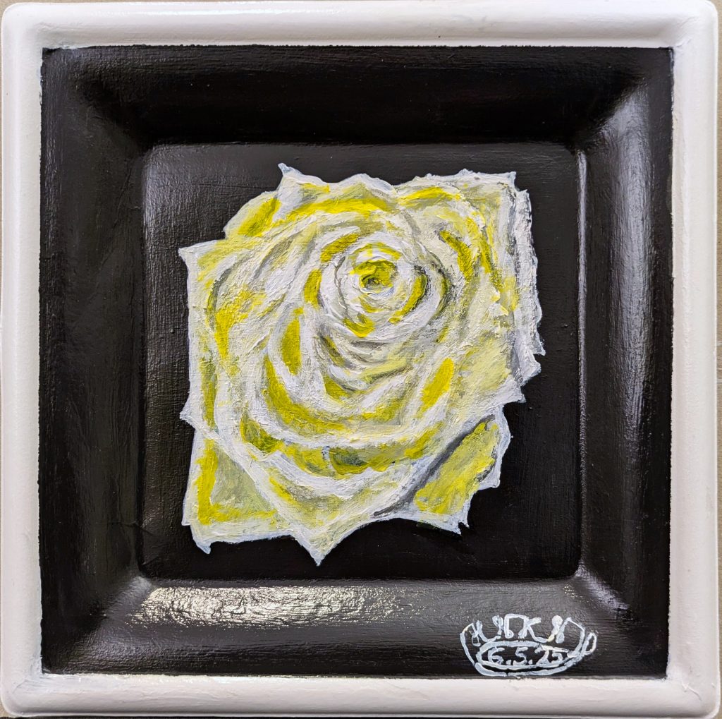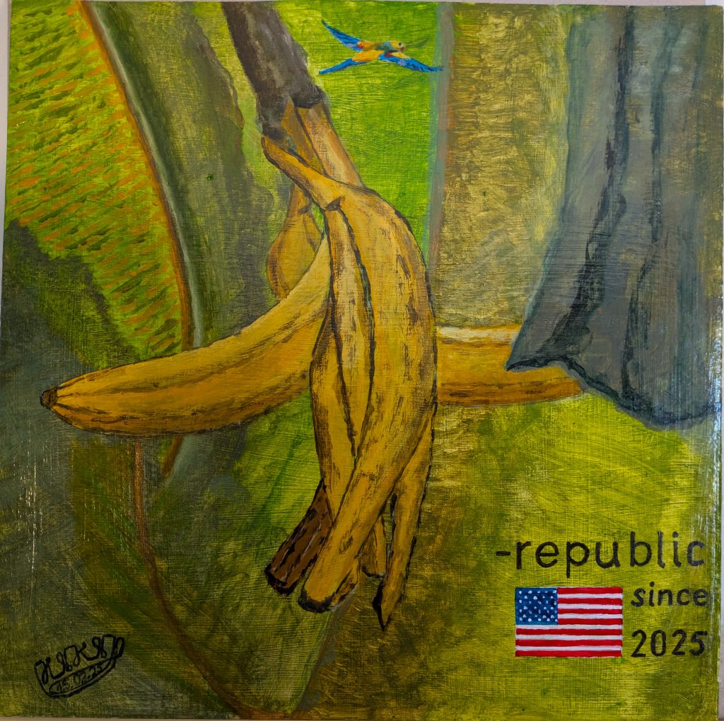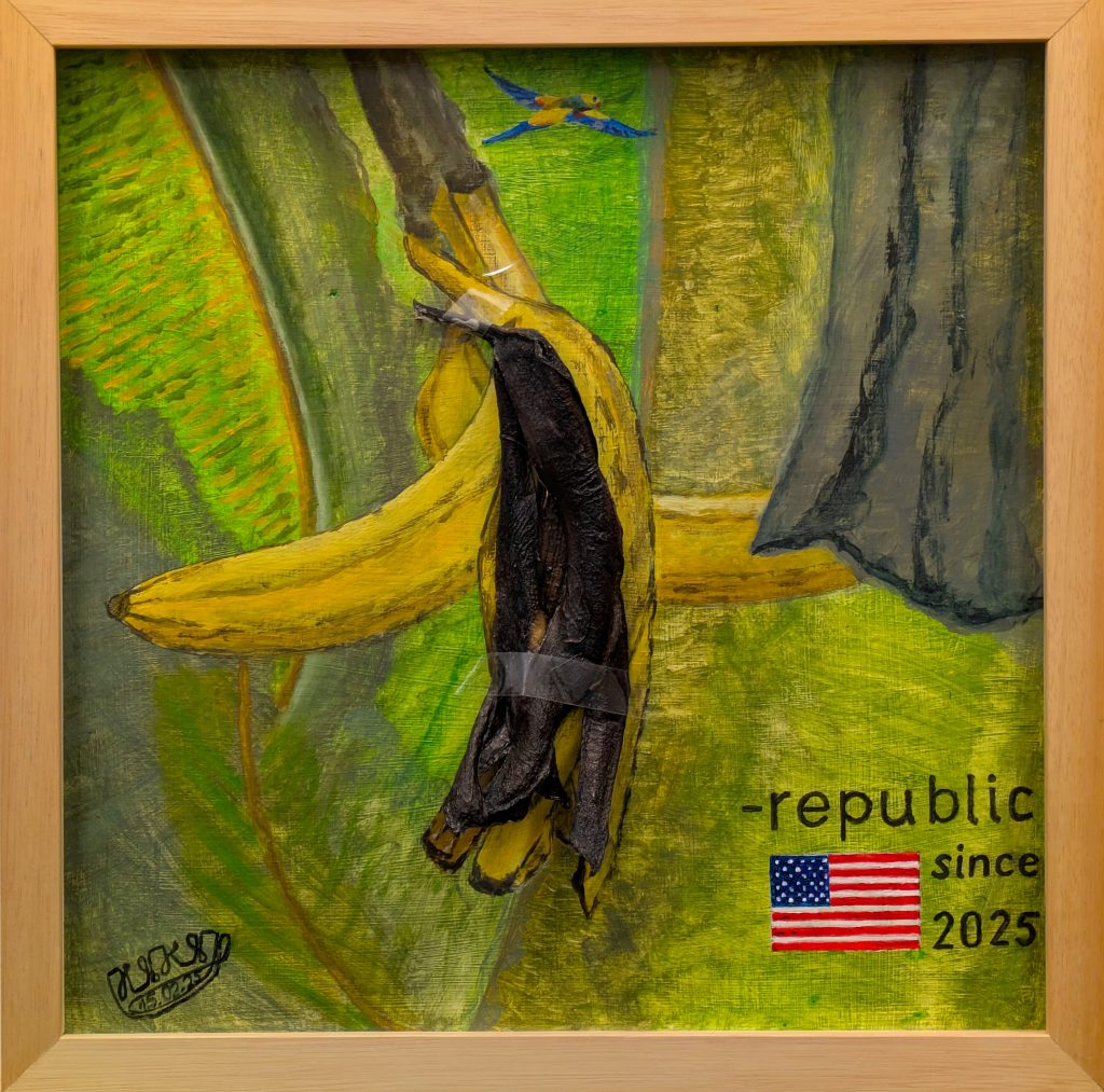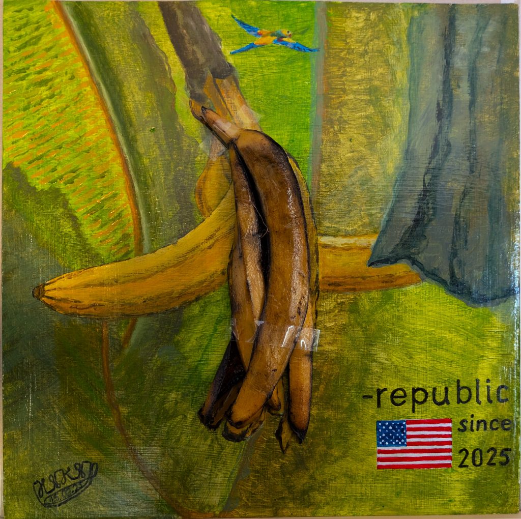„-republic“, ohne Schale, US-Autokratie, Acryl auf Wellpappe, 34,5 x 34,5 cm, HHKHH 2025/02„-republic“, mit Schale nach 2 Tagen, US-Autokratie, Acryl und B-Schale auf Wellpappe, 34,5 x 34,5 cm, HHKHH 2025/02„-republic, as time goes by“, mit Schale nach 12 Tagen, US-Autokratie, Acryl und B-Schale auf Wellpappe, 34,5 x 34,5 cm, HHKHH 2025/03