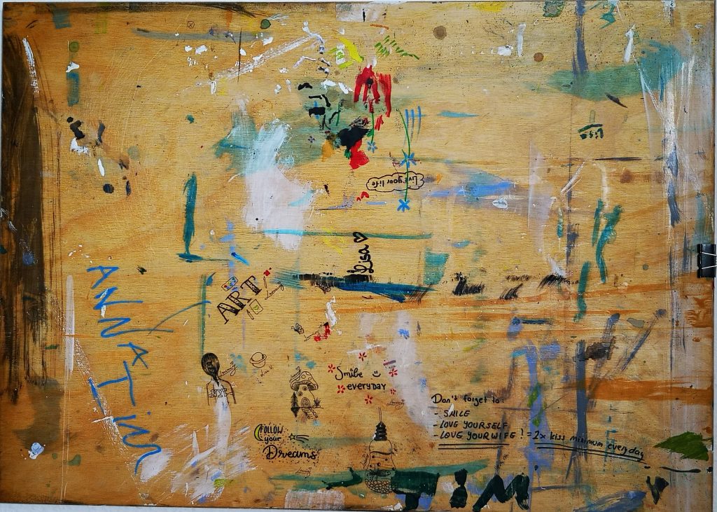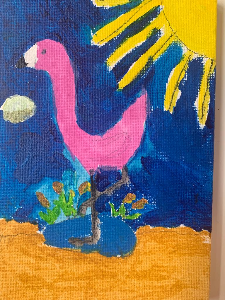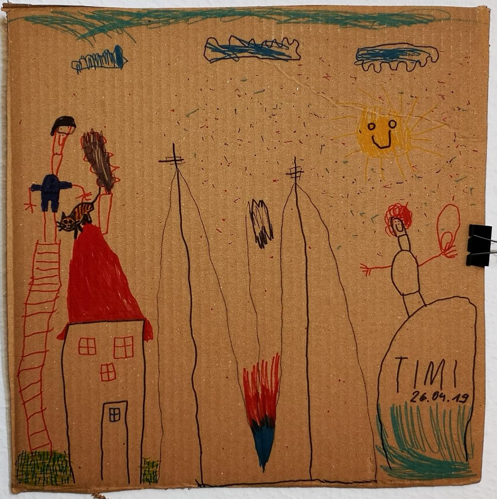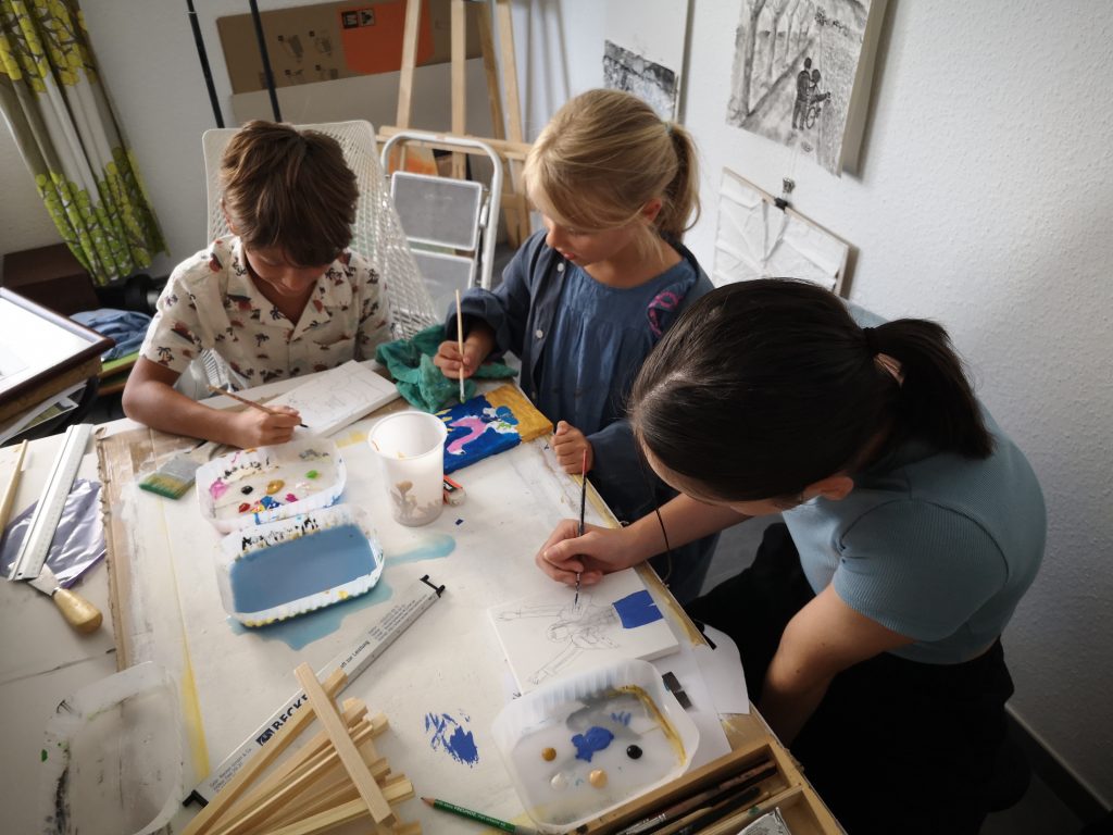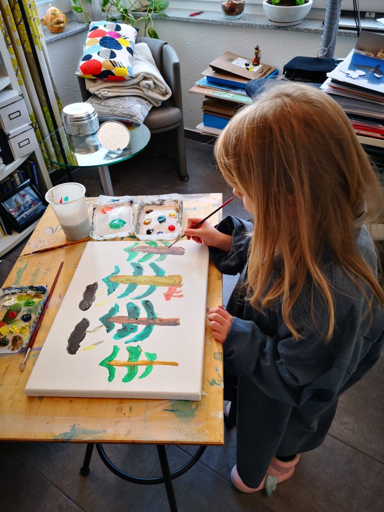 Im Atelier am 18.07.2023„junkook“, Schwarm, Acryl auf Leinwand, 12×18 cm, Lisa-Sophie Kischkewitz, 2023/07„flamingo“, lustiger Vogel, Acryl auf Leinwand, 12×18 cm, Anna-Josephine Kischkewitz, 2023/07„apache 207“, Vorbild, Acryl auf Leinwand, 12×18 cm, Tim-Jonathan Kischkewitz (+HHKHH), 2023/07Tischplatte im Atelier mit Inschriften, Sperrholz