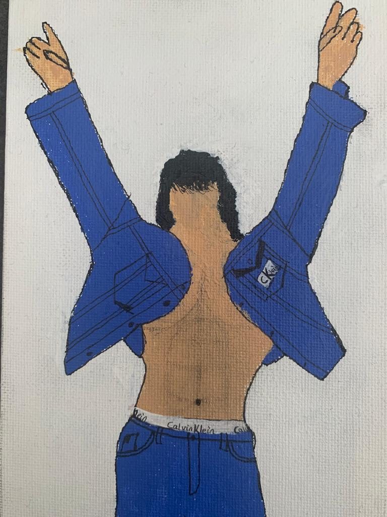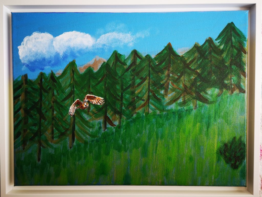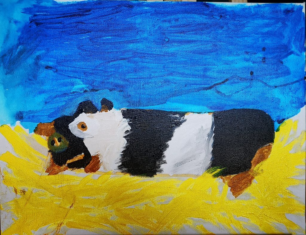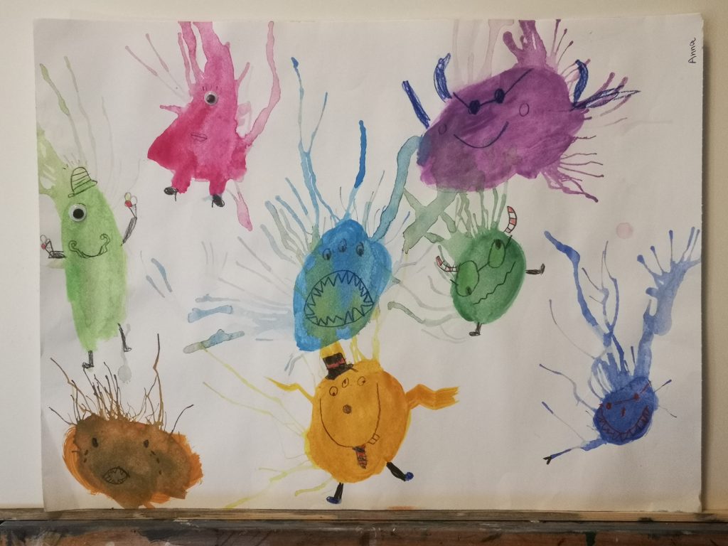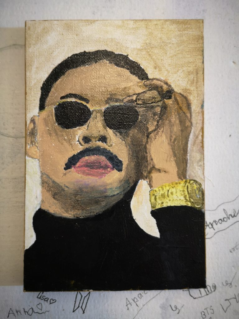 Im Atelier am 18.07.2023„junkook“, Schwarm, Acryl auf Leinwand, 12×18 cm, Lisa-Sophie Kischkewitz, 2023/07„flamingo“, lustiger Vogel, Acryl auf Leinwand, 12×18 cm, Anna-Josephine Kischkewitz, 2023/07„apache 207“, Vorbild, Acryl auf Leinwand, 12×18 cm, Tim-Jonathan Kischkewitz (+HHKHH), 2023/07Tischplatte im Atelier mit Inschriften, Sperrholz