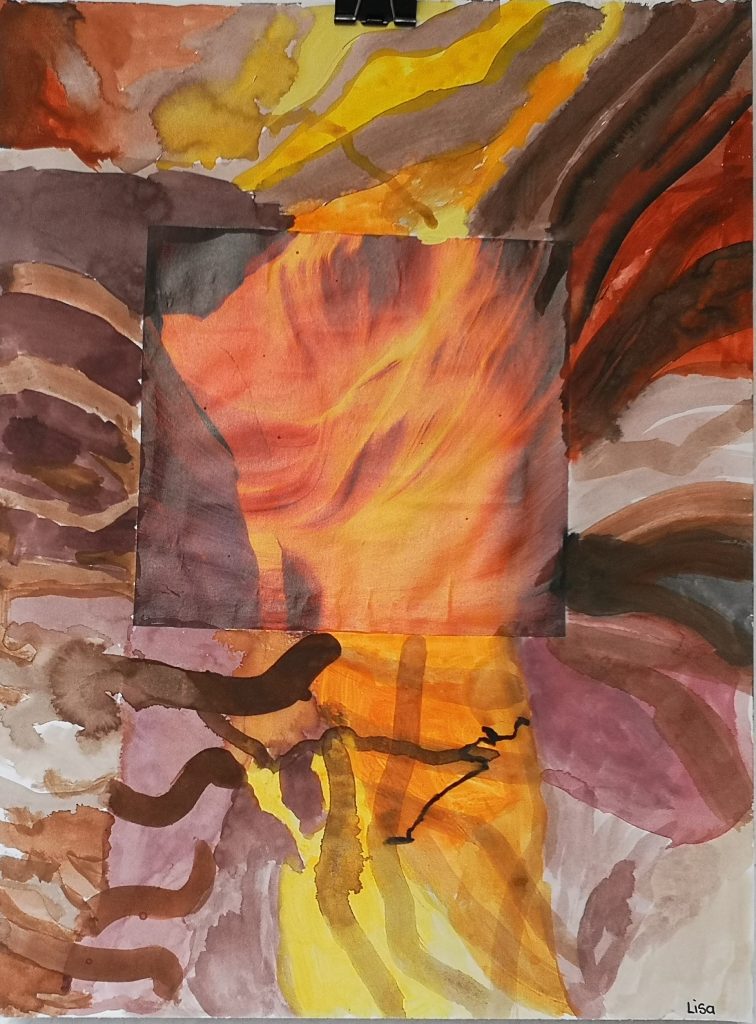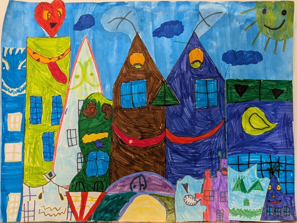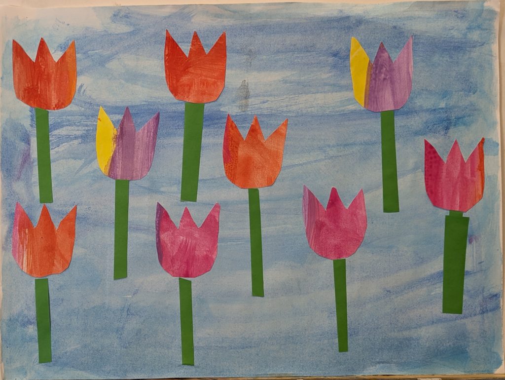 „ohne titel“, Collage, Mixed Media, 12 x 17 cm, Lisa-Sophie Kischkewitz, 2024/12„bunte stadt“, James Rizzi, Filzstift-Collage auf Malpapier, 39 x 29,5 cm, Tim-Jonathan Kischkewitz, 2024/12„tulpenfeld“, Collage auf tuschegrundiertem Malpapier, 39,5 x 29,5 cm, Anna-Josephine Kischkewitz, 2024/07